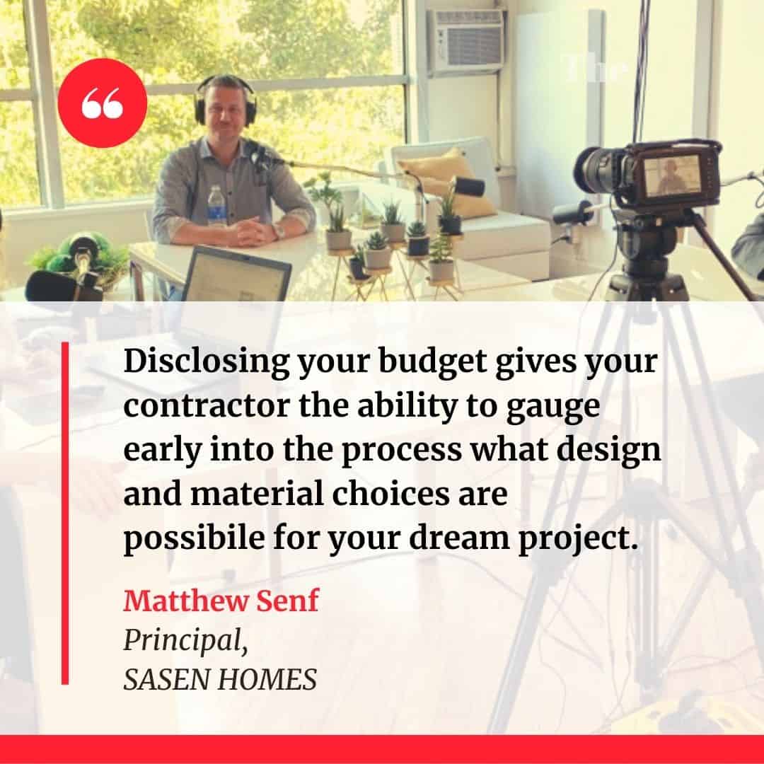 And just understanding the budget because sometimes when people give you a budget sheet, it can just look like a whole mess to you. You’re like, I don’t understand what this is. And so you want to be able to know, like, why am I paying for the extra coat of paint on that wall? You want to know all these things, because at the end of the day, the more you know about the nuts and bolts of your home, then you’re going to understand why it costs the way it costs and why it’s important to have those things in your home for longevity. I’m so excited to have somebody in the studio besides Mike and I, which I do enjoy your company, Mike, I just nice to have another person in here. We’ve got Matt Senf from Sasen homes. How are you today?